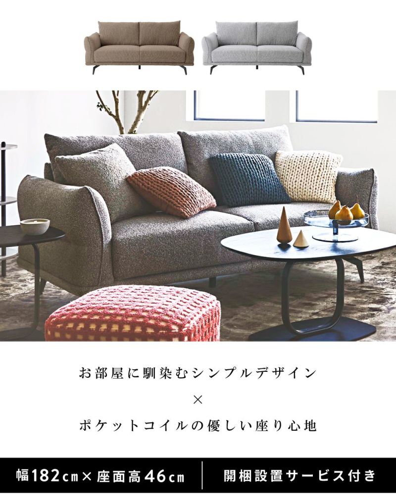 ソファー 2人掛け 幅182cm ポケットコイル 北欧 Sバネ ウィービングベルト おしゃれ 肘掛け 茶色 リビング ダイニング 2P ワイド グレー シンプル スチール脚 布