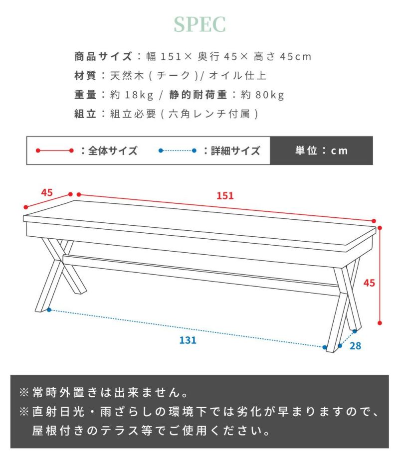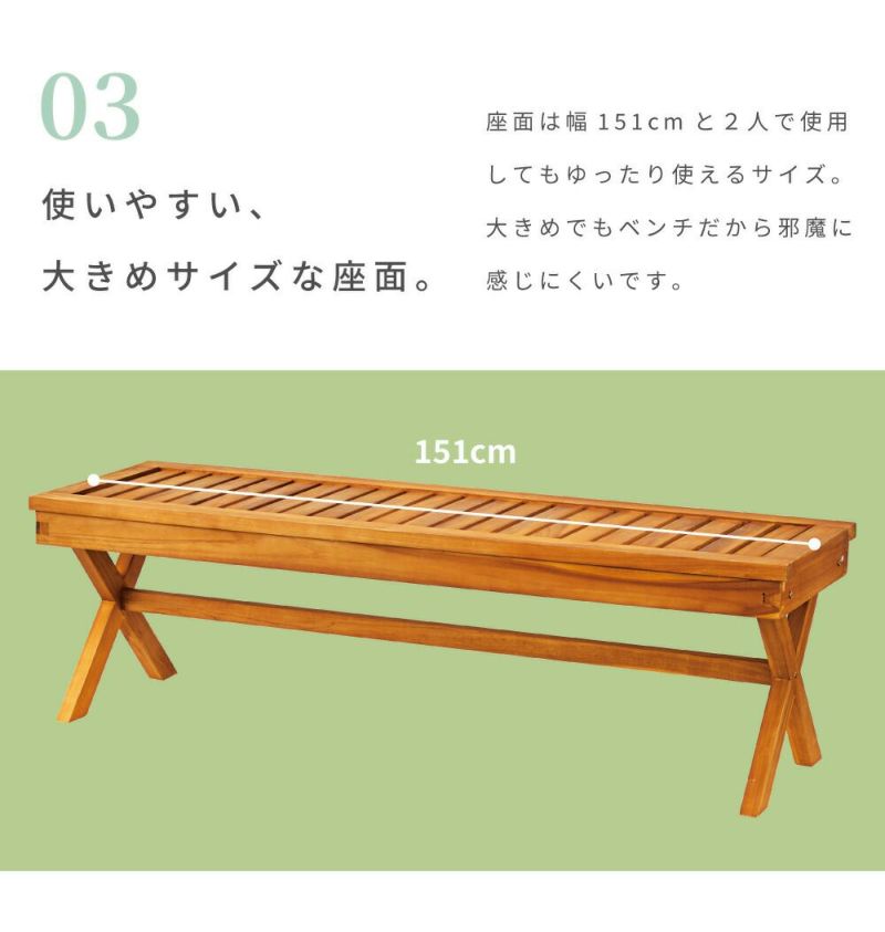 ガーデンベンチ ベンチ アウトドアベンチ 天然木 木製 おしゃれ シンプル 椅子 庭 ガーデン テラス 幅151cm 高さ45 腰掛 ダイニングベンチ 背もたれなし 肘なし