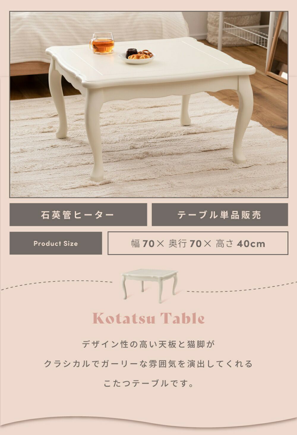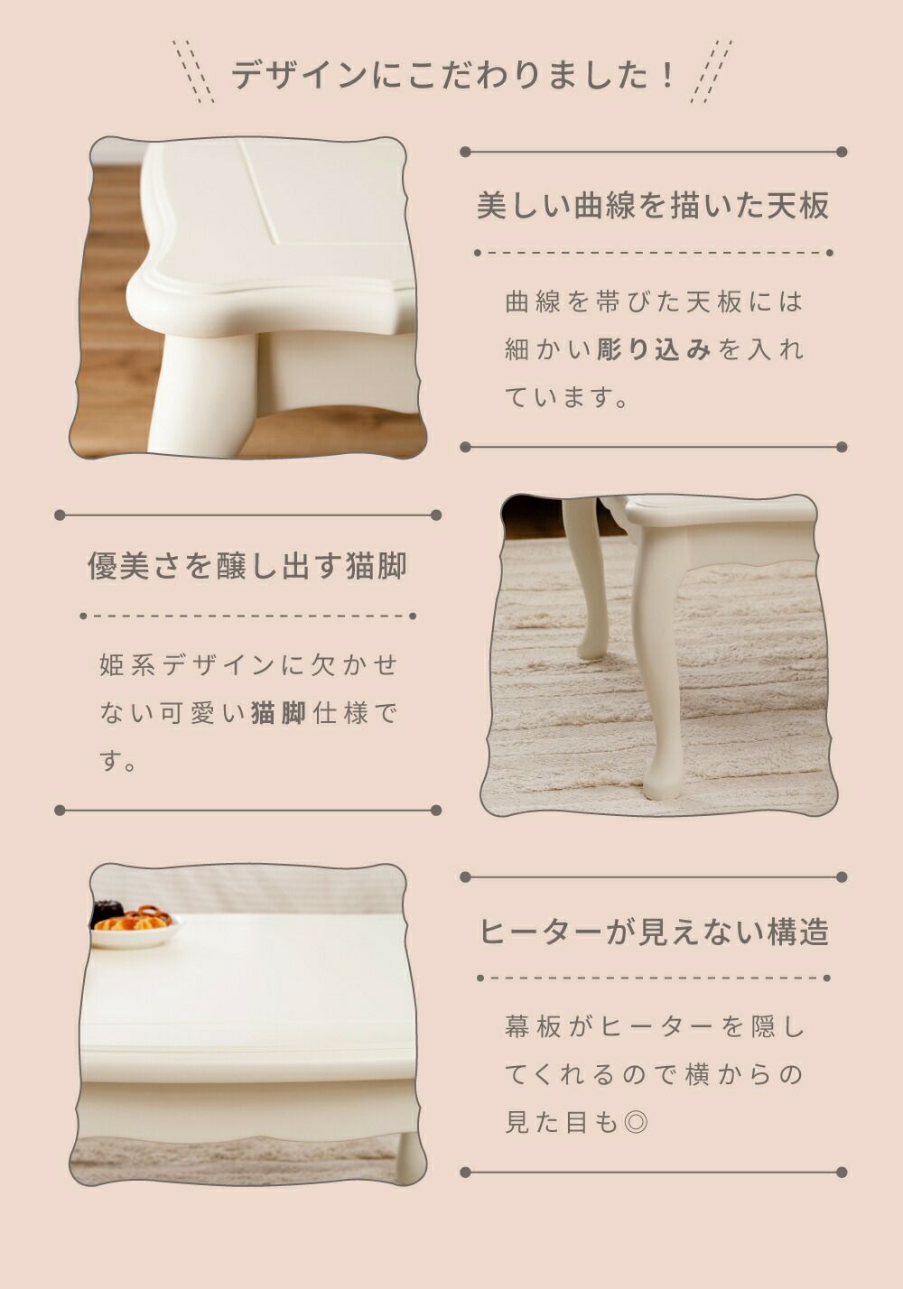 他の画像を見る ガーリーな猫脚が特徴のこたつテーブル ローテーブル こたつ こたつテーブル 幅70cm 正方形 猫脚 猫足 コタツ|WILO 送料無料 ¥ 51,920 税込 (0) お気に入りに登録する