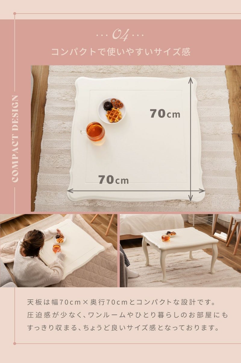 こたつ こたつテーブル 猫脚 おしゃれ 正方形 70 ガーリー 木製 石英管 コンパクト オールシーズン コーヒーテーブル センターテーブル かわいい エレガント 白 机 ローテーブル