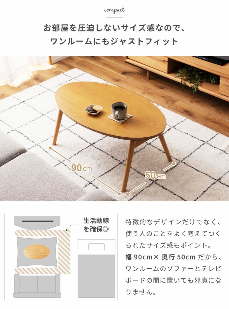 こたつ テーブル 折りたたみ 幅90 おしゃれ コンパクト スリム コーヒーテーブル センターテーブル 1人用 北欧 完成品 ナチュラル オーバル 楕円形 石英管ヒーター 隙間収納 角丸