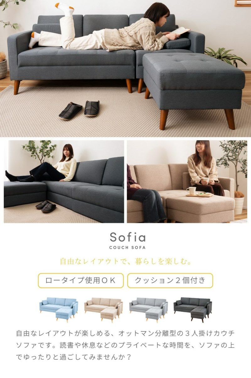 自由なレイアウトが楽しめるL字ソファ ソファ 3人掛け カウチ オットマン 北欧 おしゃれ モダン ロータイプ|SOFIA