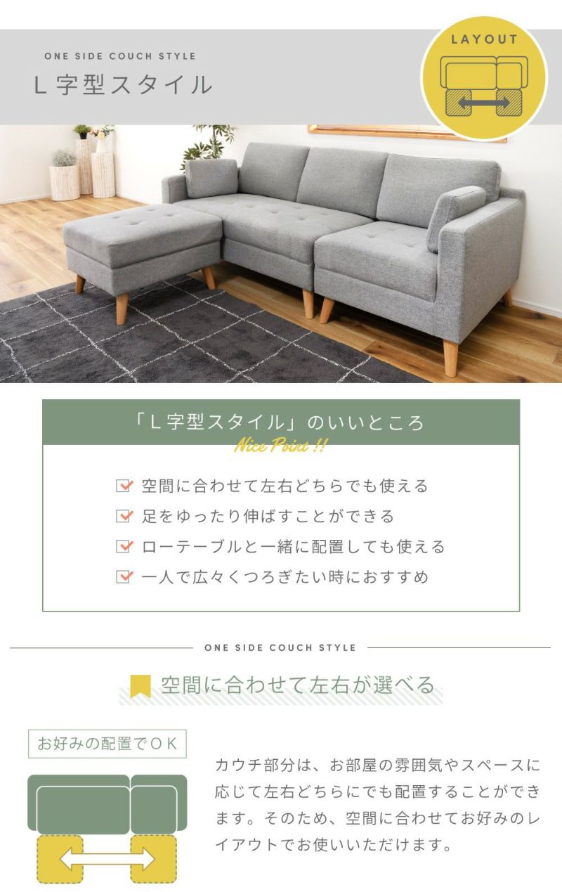カウチ部分は、お部屋の雰囲気やスペースに応じて左右どちらにでも配置することができます。