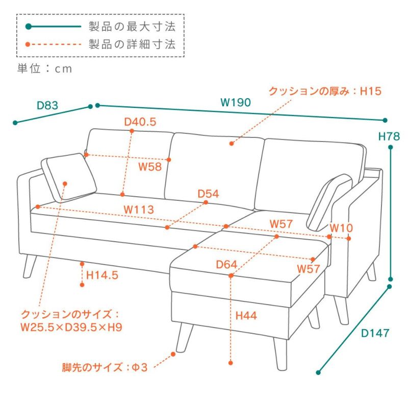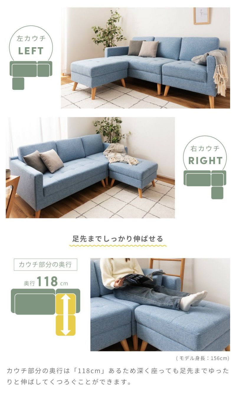 カウチ部分の奥行は「118cm」あるため深く座っても足先までゆったりと伸ばしてくつろぐことができます。