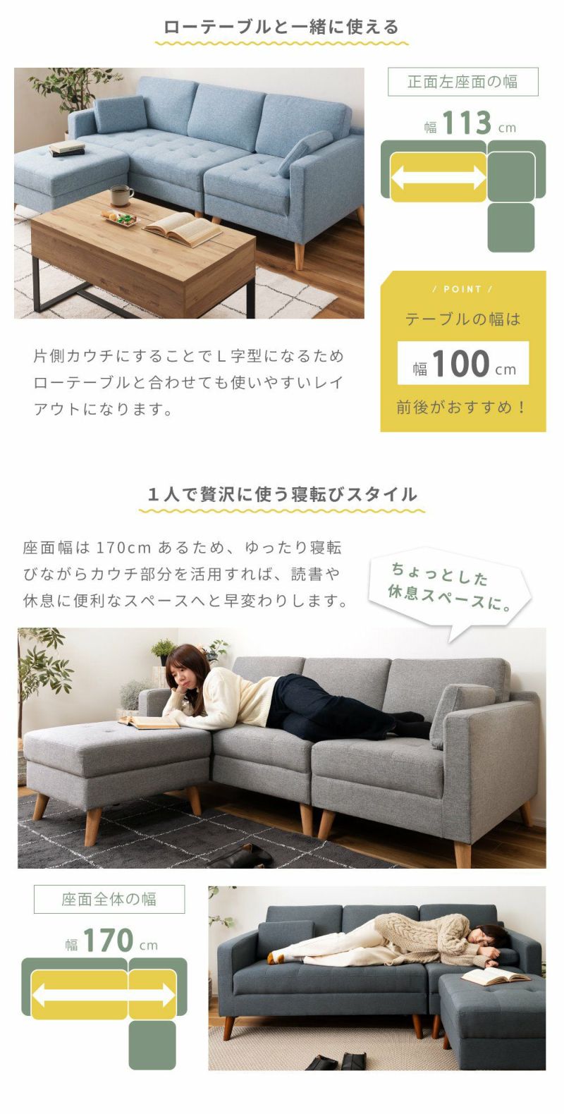 座面幅は170cmあるため、ゆったり寝転びながらカウチ部分を活用すれば、読書や休息に便利なスペースへと早変わりします。