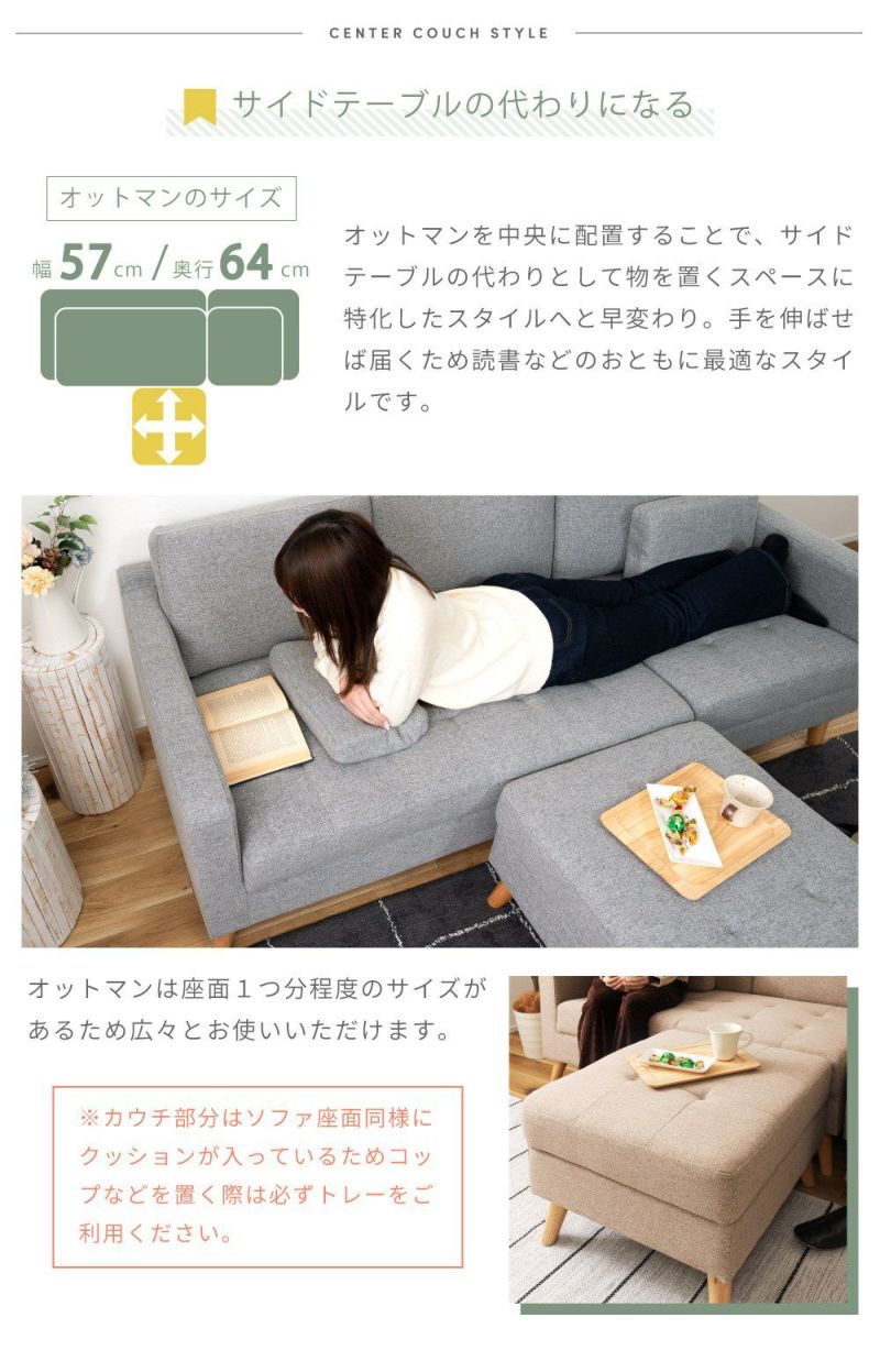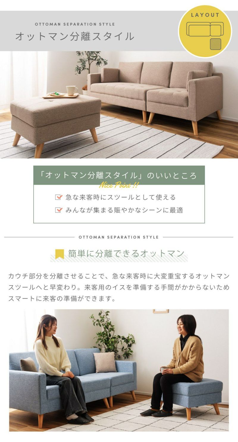 ●自由なレイアウトが楽しめる、オットマン分離型の3人掛けカウチソファです。