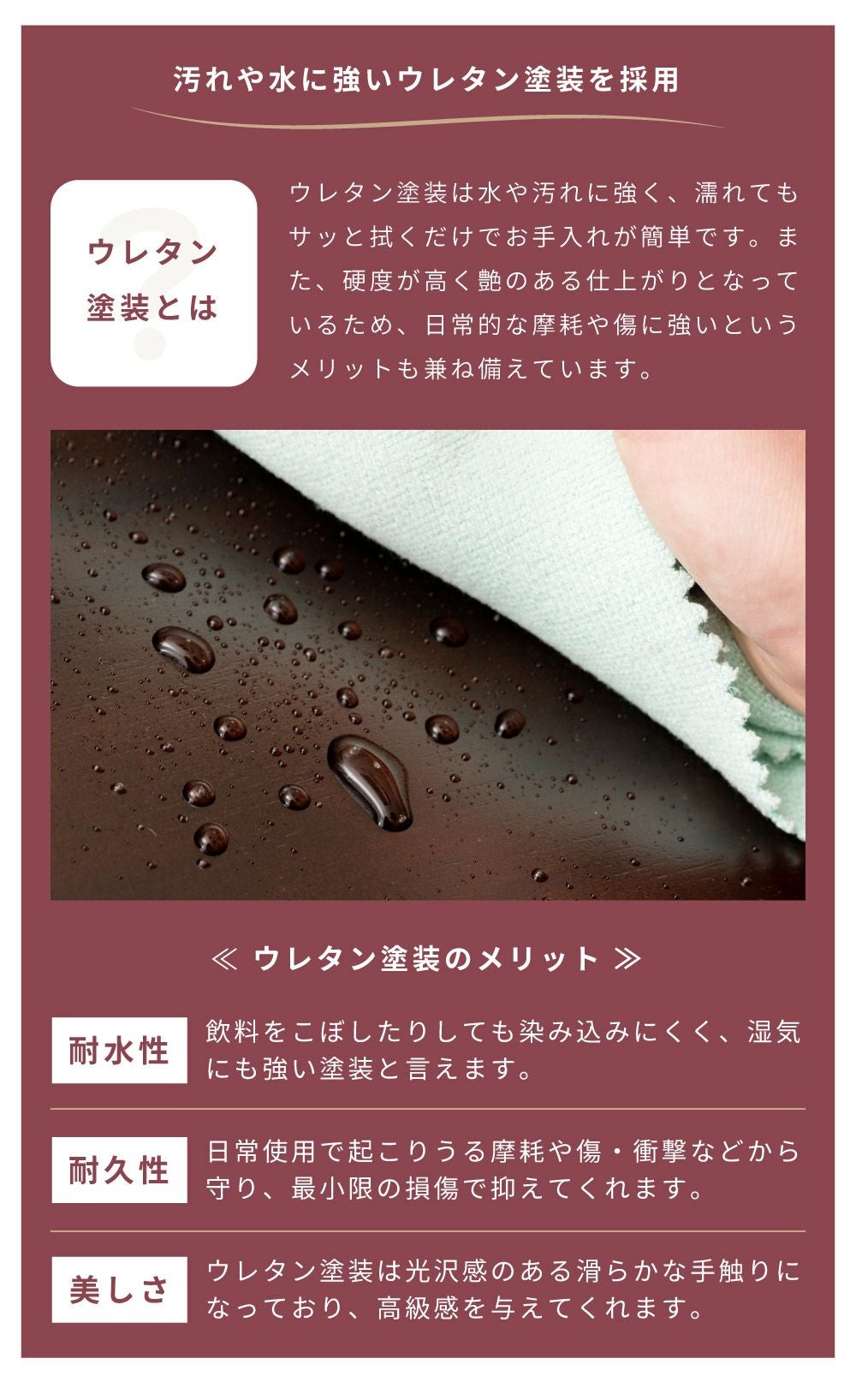 ウレタン塗装は水や汚れに強く、濡れてもサッと拭くだけでお手入れが簡単です。