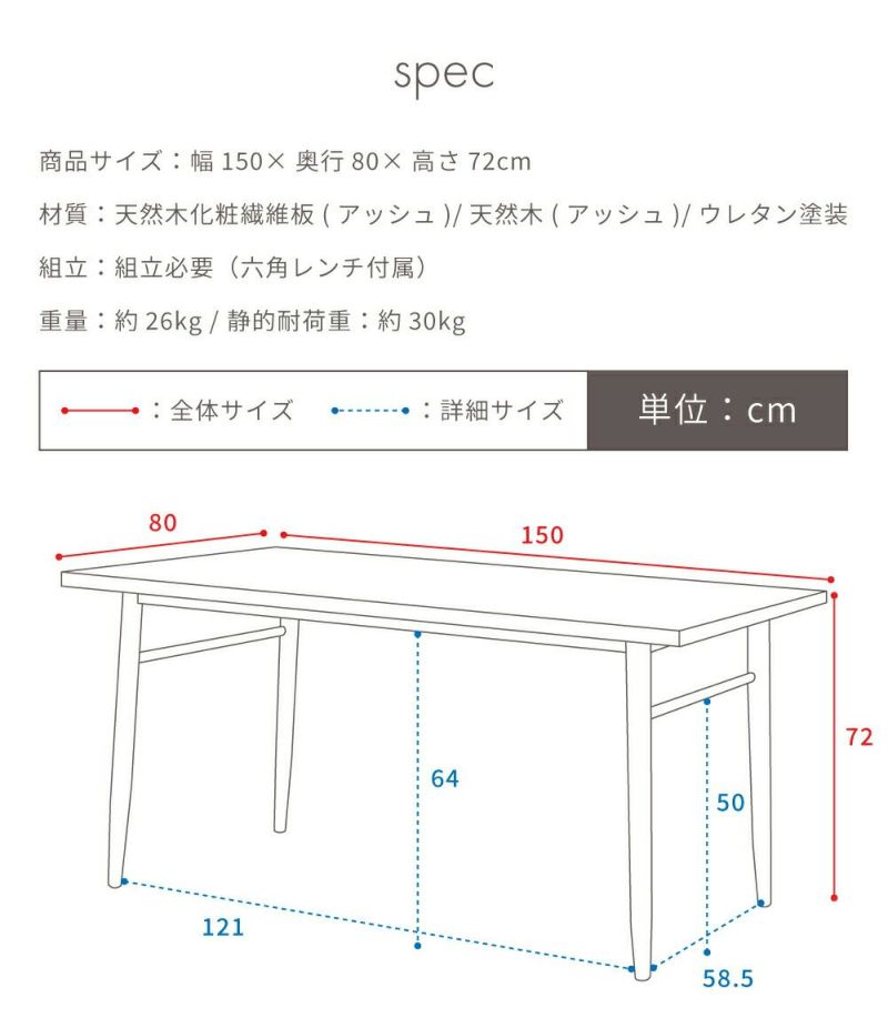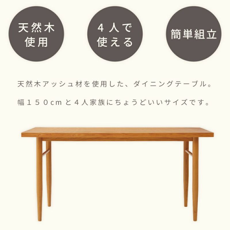 ダイニングテーブル 食卓テーブル テーブル 机 幅150cm 天然木 4人用 おしゃれ 木製 北欧 シンプル ナチュラル ダイニング アッシュ 長方形 ウレタン塗装