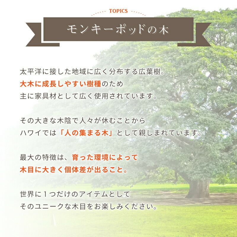 木目に重厚感のある 天然木「モンキーポッド」をラッカー塗装で仕上げ、天然木の自然な質感を活かしました。
