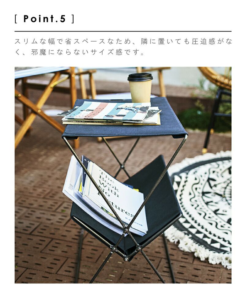 ●天板にMDFの板が入ったサイドテーブル。フォールディングができ、持ち運びに便利なので、アウトドアにもピッタリです。