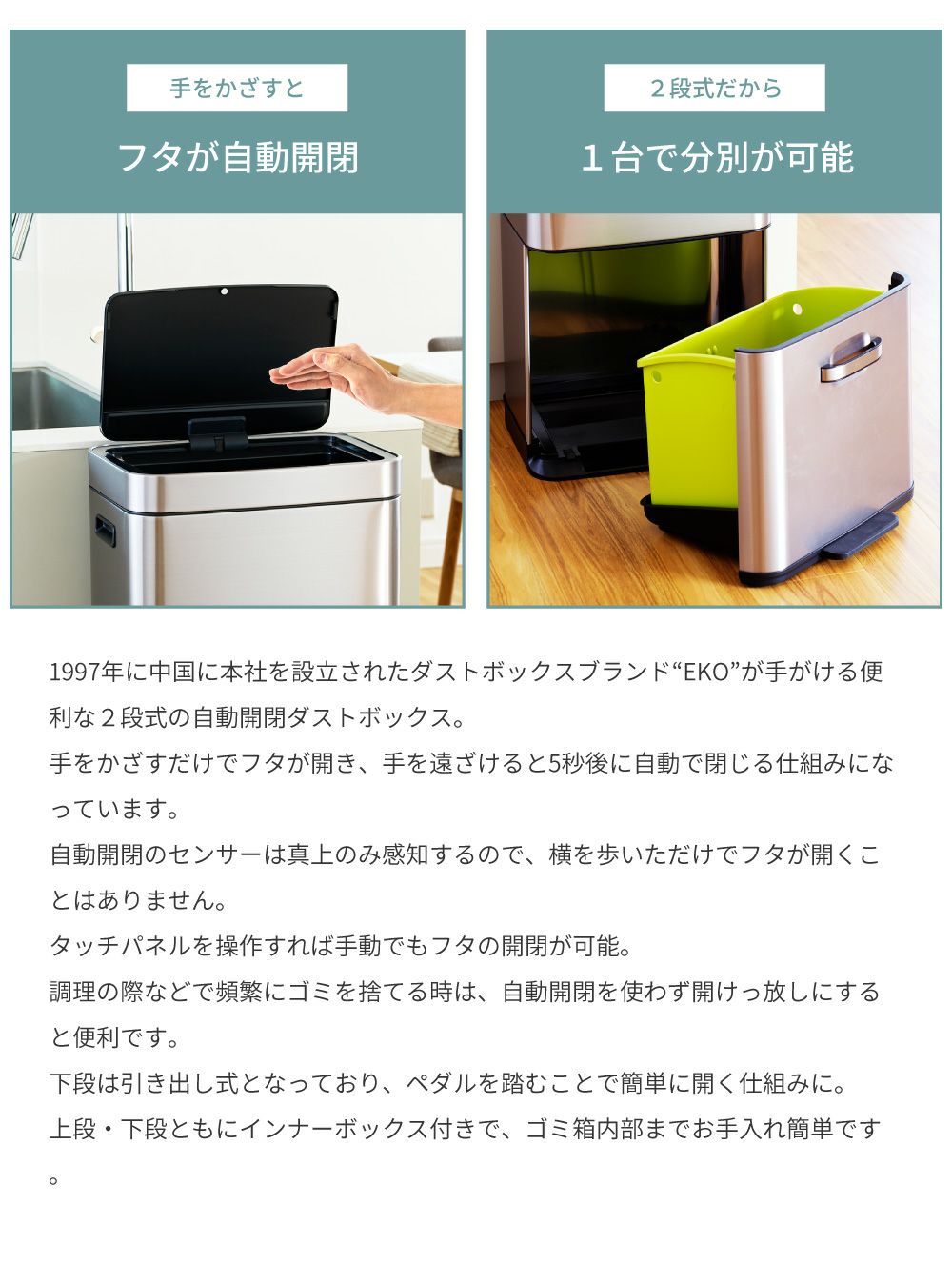 他の画像を見る スマートに自動開閉 EKO ごみ箱 分別 2段 25リットル 35リットル 自動開閉 ゴミ箱 新生活 一人暮らし 模様替え|ヒマラヤセンサービン 完成品 販売価格 ¥ 38,500 税込 在庫切れ (0) お気に入りに登録する