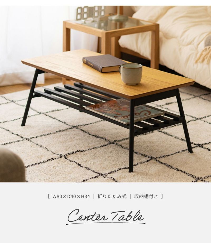 棚付き・折りたたみテーブル 幅80cm 折りたたみテーブル 幅80cm ローテーブル 収納 センターテーブル|Paul