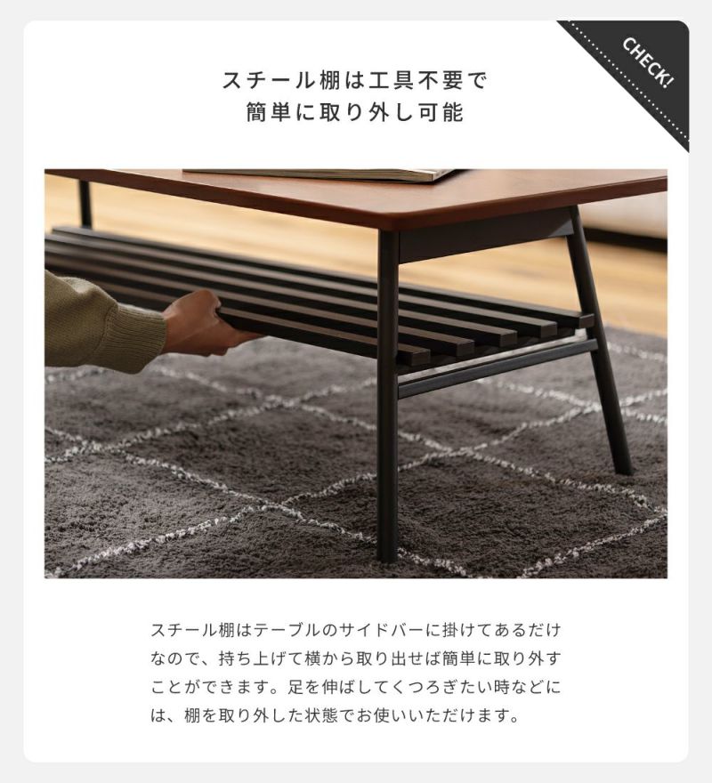 スチール棚はテーブルのサイドバーに掛けてあるだけなので、持ち上げて横から取り出せば簡単に取り外すことができます。