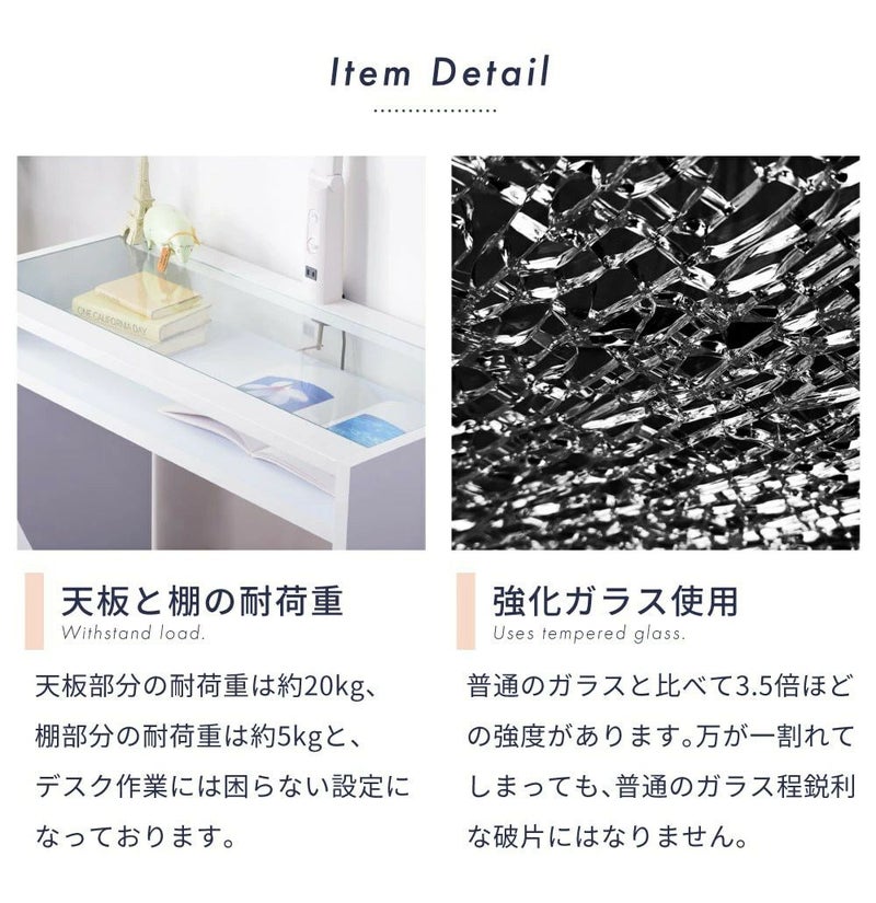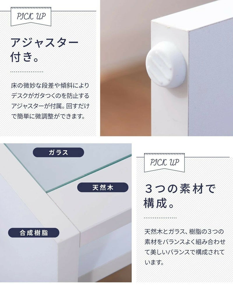 材質 デスク:合成樹脂化粧繊維板/天然木(パイン)/5mm強化ガラス/ラッカー塗装
