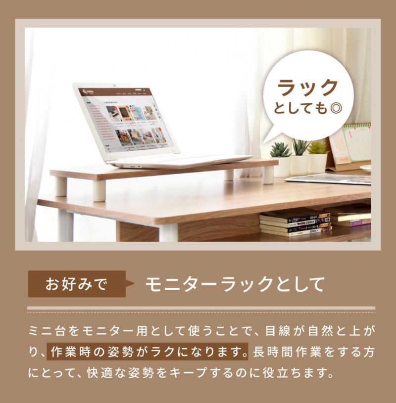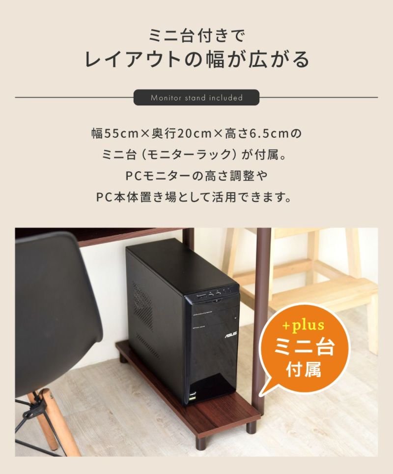 幅55cm×奥行20cm×高さ6.5cmのミニ台(モニターラック)が付属。PCモニターの高さ調整やPC本体置き場として活用できます。デスク上のデッドスペースを「収納」に変えてくれる頼れる相棒です.