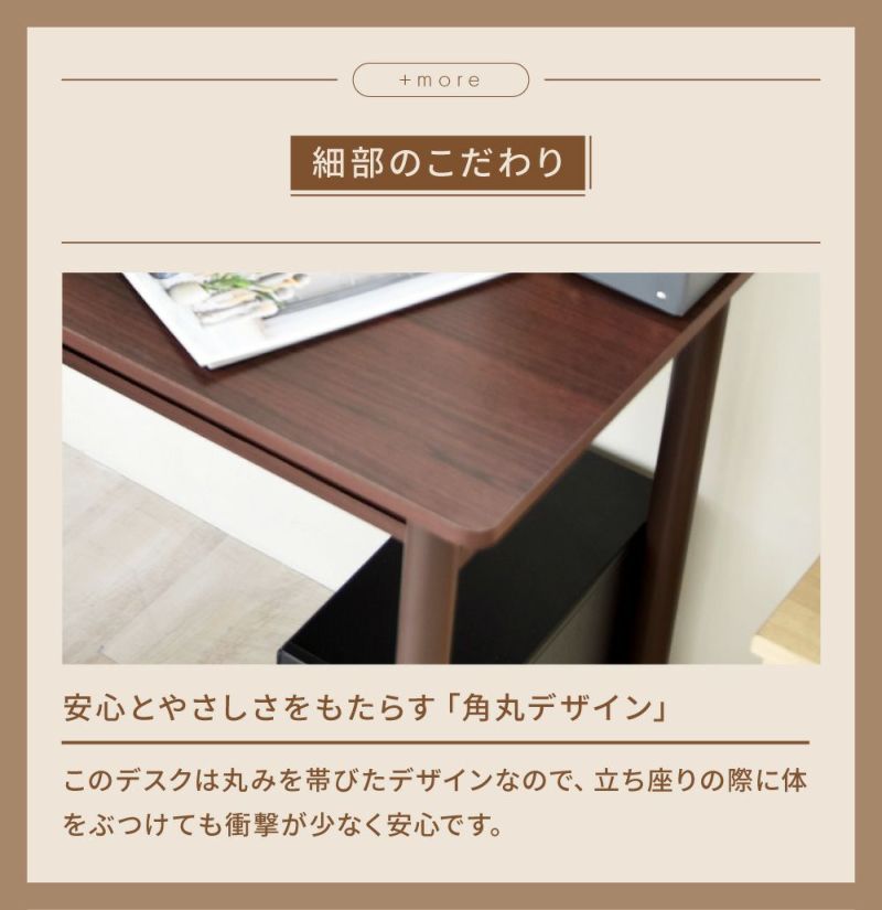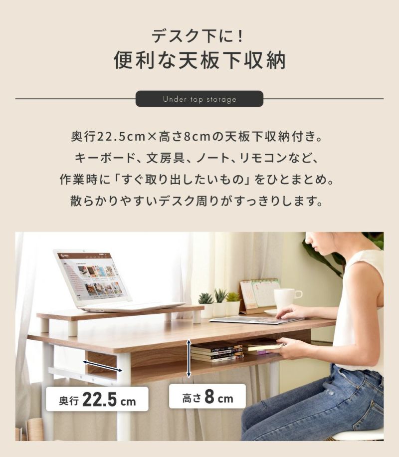 天板下には、奥行22.5cm×高さ8cmのオープン収納。キーボード、文房具、ノート、リモコンなど、作業時に「すぐ取り出したいもの」をひとまとめ。散らかりやすいデスク周りがすっきりします。