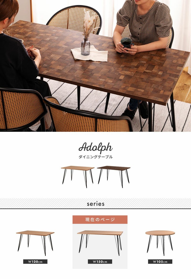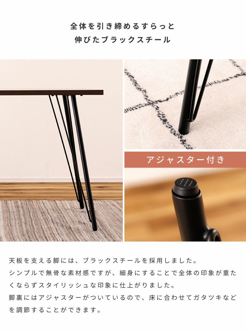 温もりのある木目調デザインとシンプルなアイアンが特徴のダイニングテーブル。