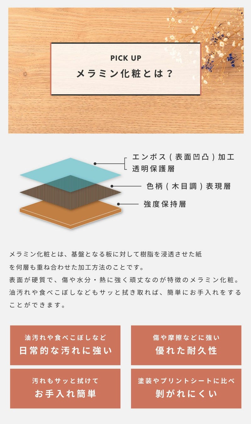 メラミン化粧繊維板を採用することで、日常の汚れや傷に強く使いやすい仕様となっております。