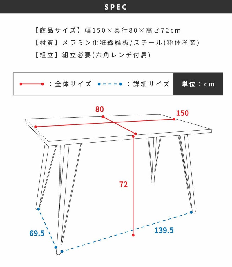 横幅は150cmと、ゆったり大きめ天板サイズとなっております。