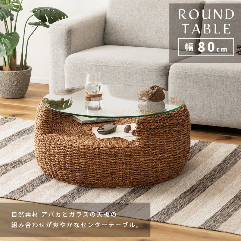 アバカとガラスの天板が爽やかなセンターテーブル ローテーブル 幅80cm センターテーブル 丸テーブル ガラステーブル|DELIX