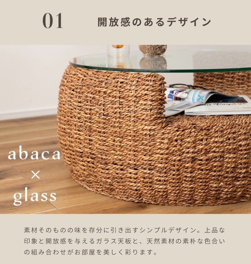 ●自然素材 アバカとガラスの天板の組み合わせが爽やかなセンターテーブル。