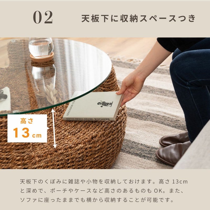 コーヒーテーブル センターテーブル 幅80 ローテーブル 収納 ディスプレイ リビング ガラス ラウンド 机 丸 円形 アバカ ナチュラル リゾート アジアン ナイトテーブル サイドテーブル マニラ麻