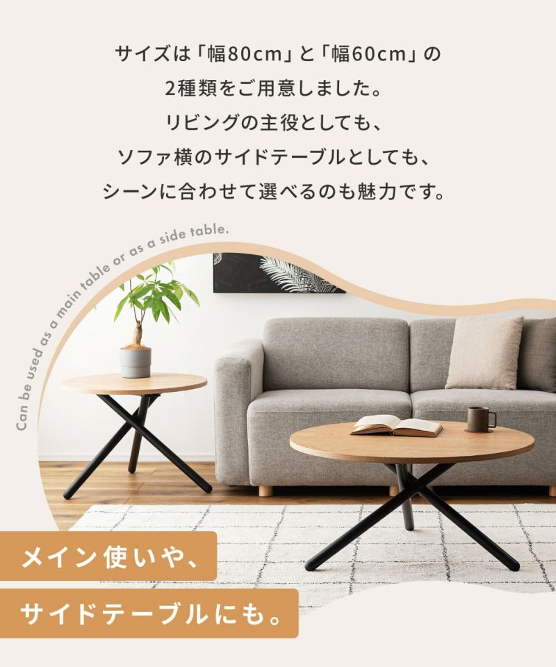 「幅80cm」と「幅60cm」の2サイズのラウンドテーブルをご用意いたしました。