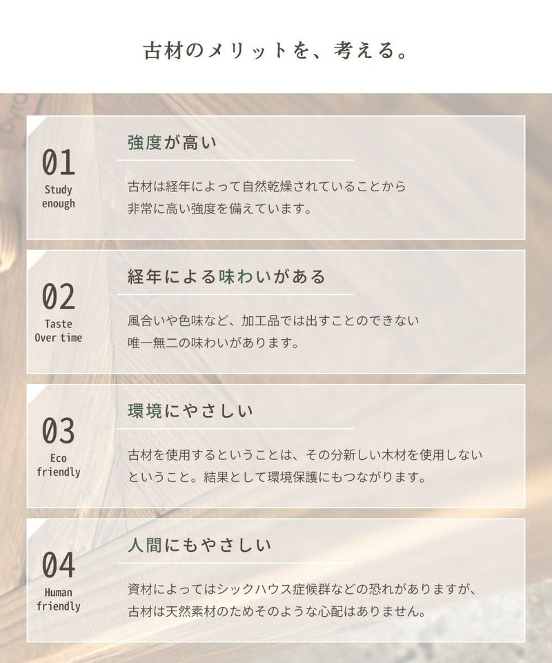 資材によってはシックハウス症候群などの恐れがありますが、古材は天然素材のためそのような心配はありません。