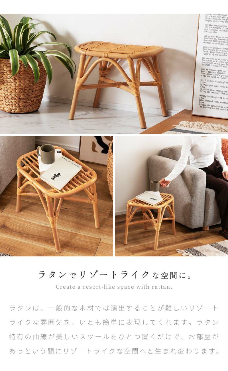 ラタン特有の曲線が美しいスツールをひとつ置くだけで、お部屋があっという間にリゾートライクな空間へと生まれ変わります。