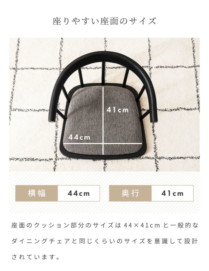座面のクッション部分のサイズは44×41cmと一般的なダイニングチェアと同じくらいのサイズを意識して設計されています。
