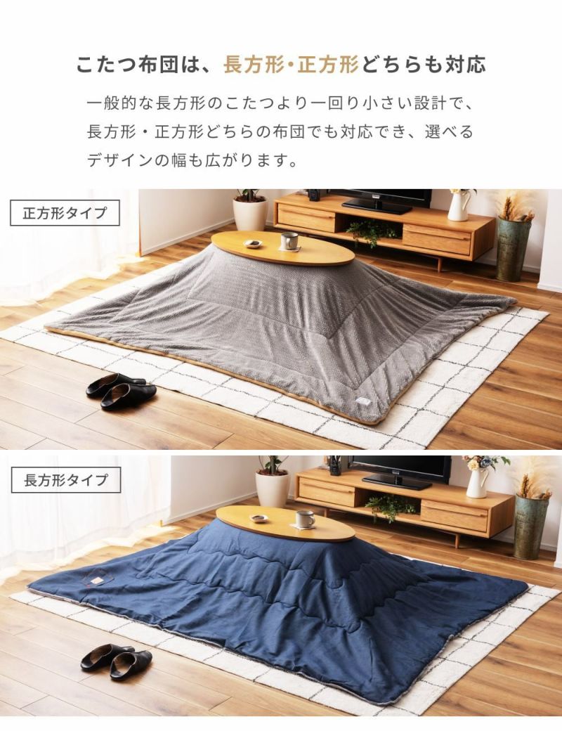 一般的な長方形のこたつより一回小さい設計で、長方形・正方形どちらの布団でも対応でき、選べるデザインの幅も広がります。