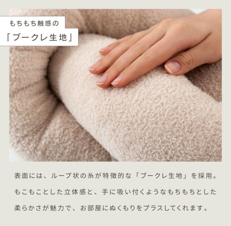●表面には、ループ状の糸が特徴的な「ブークレ生地」を採用。もこもことした立体感と、手に吸い付くようなもちもちとした柔らかさが魅力で、お部屋にぬくもりをプラスしてくれます。