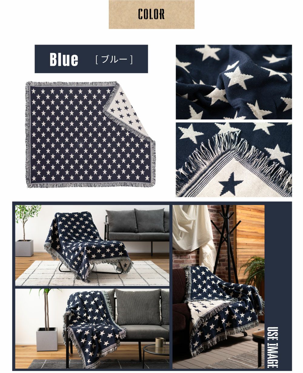 他の画像を見る アメリカンヴィンテージ風星柄ブランケット ブランケット 130×150 大判 星 スター ひざ掛け 膝掛け コットン|FAERA 完成品 ¥ 4,224 税込 (0) お気に入りに登録する
