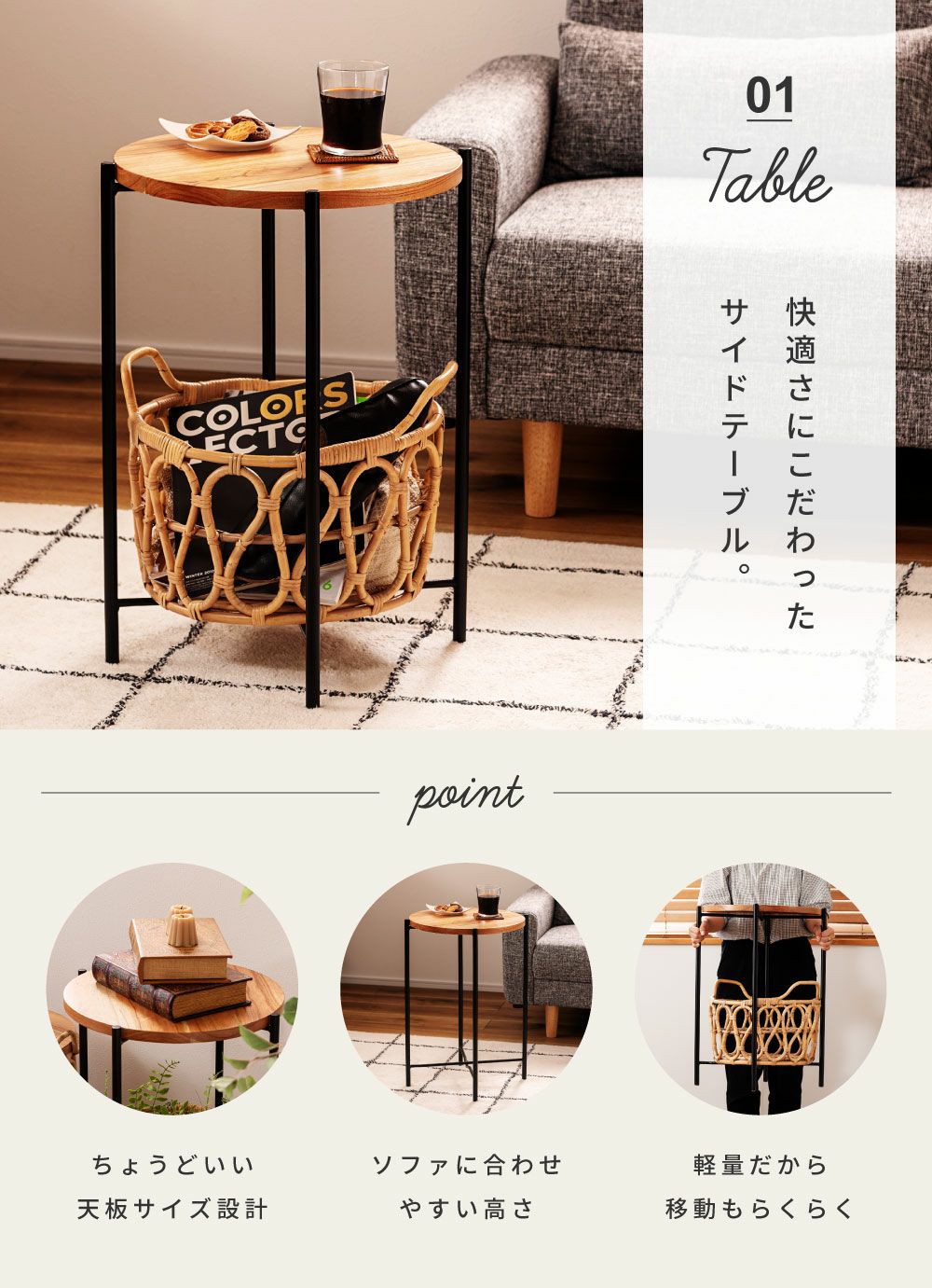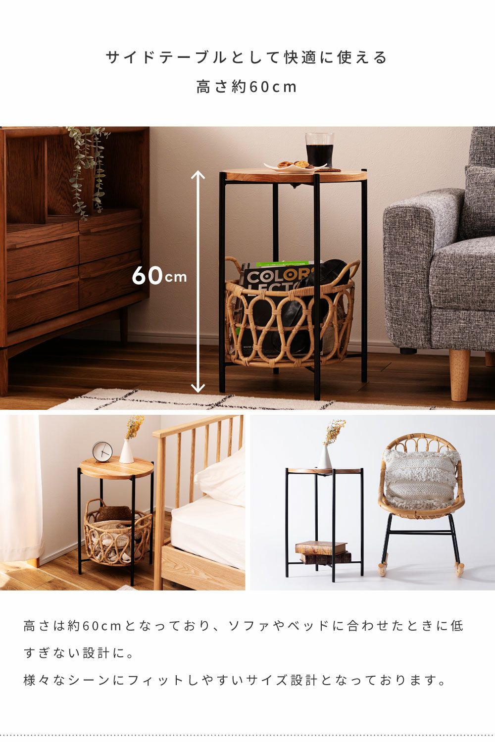 北欧モダンにラタン風の装飾をプラス サイドテーブル 高さ50cm ラタン調 ナイトテーブル おしゃれ 北欧|ROBIN