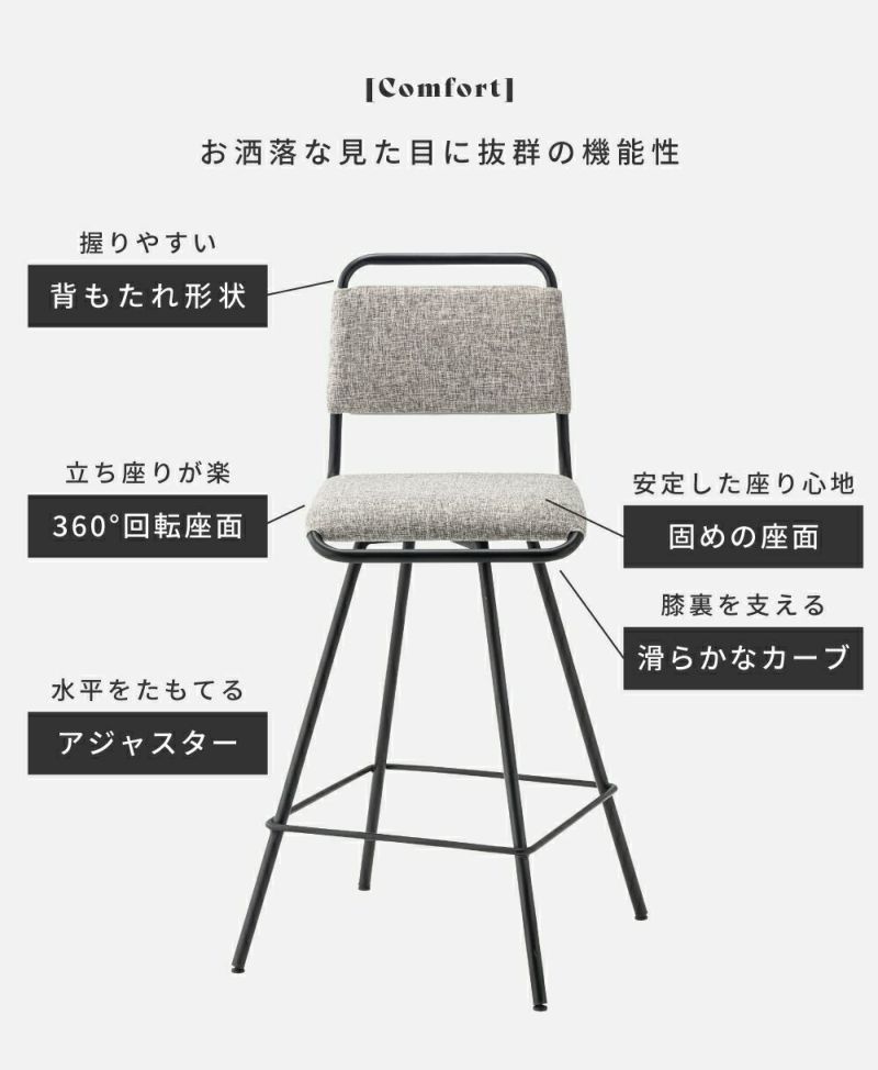 カウンターチェア ハイチェア 座面高65cm 回転チェア 椅子 回転椅子 360度回転 回転式 スチール脚 チェア イス スタイリッシュ 座面固め 背もたれあり 持ち手