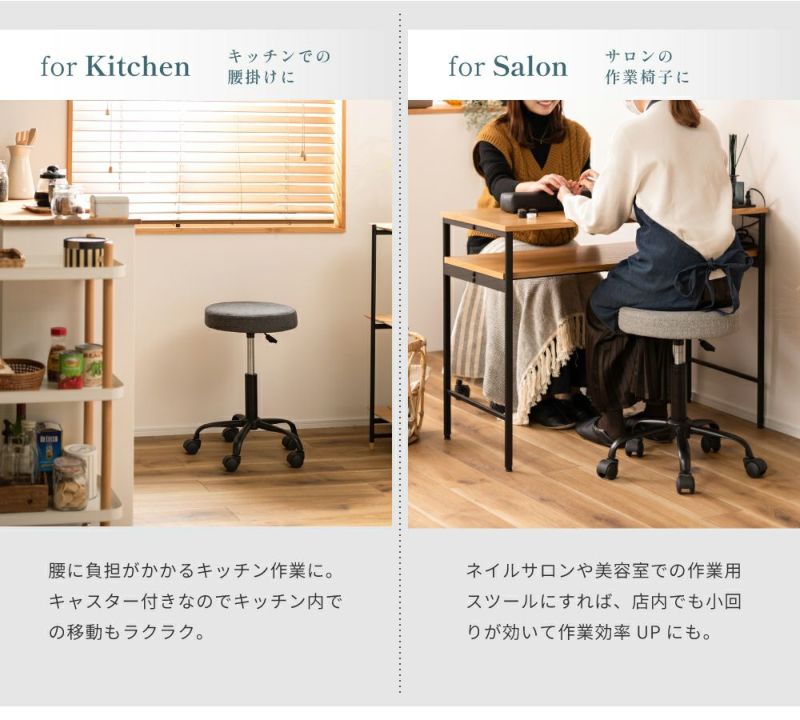 ネイルサロンや美容室での作業用スツールにすれば、店内でも小回りが効いて作業効率UPにも。