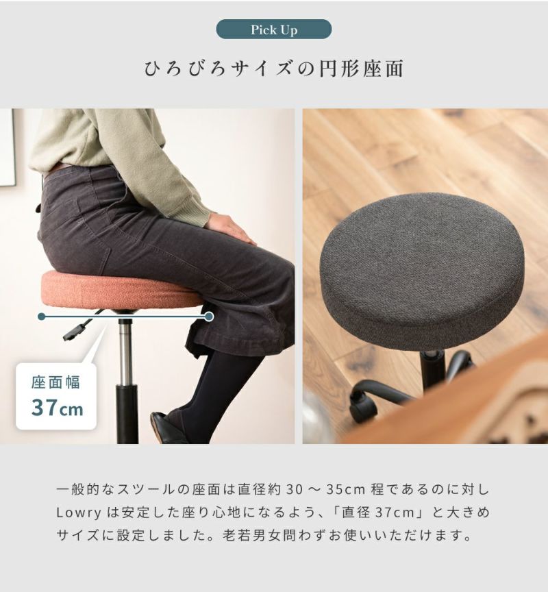 一般的なスツールの座面は直径約30〜35cm程であるのに対し、Lowryは安定した座り心地になるよう、「直径37cm」と大きめサイズに設定しました。