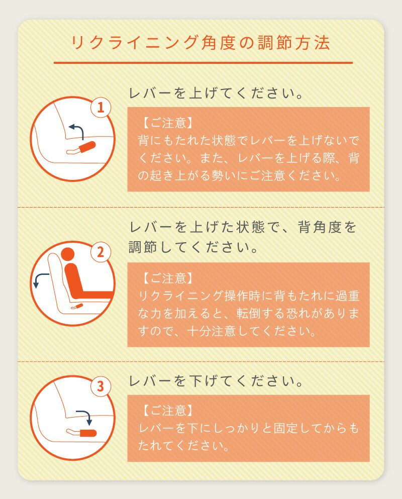 また、レバーを上げる際、背の起き上がる勢いにご注意ください。