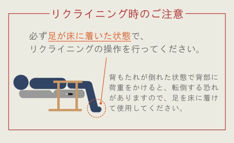 必ず足が床に着いた状態で、リクライニングの操作を行ってください。
