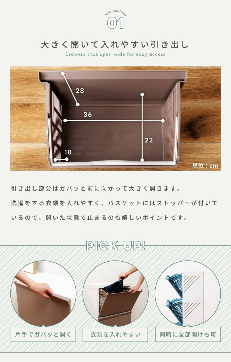 洗濯をする衣類を入れやすく、バスケットにはストッパーが付いているので、開いた状態で止まるのも嬉しいポイントです。