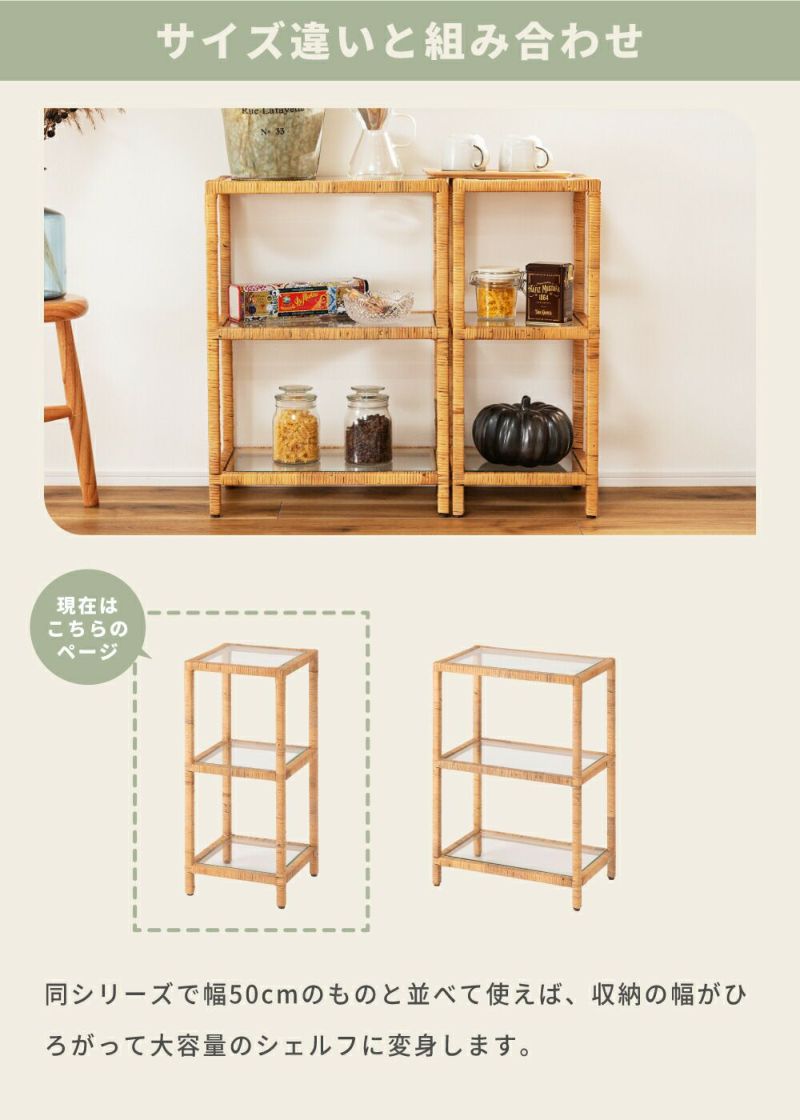 フレーム部分の天然ラタン素材に、ガラス棚板を組み合わせることで軽やかな印象に仕上げたガラスシェルフ。
