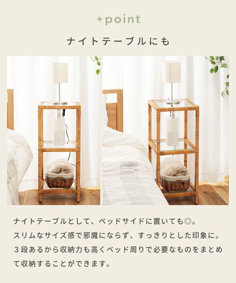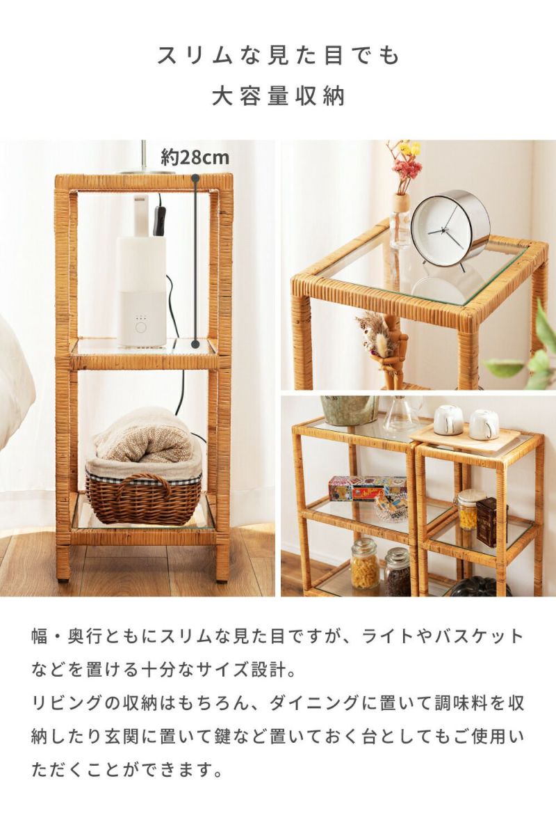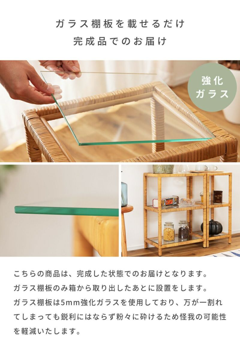シェルフ ガラス 棚 飾り棚 3段 ラタン 天然 おしゃれ 北欧 リゾート アジアン 透明 シンプル ナチュラル アジャスター 籐 ラタン ナイトテーブル サイドテーブル クリア 推し棚