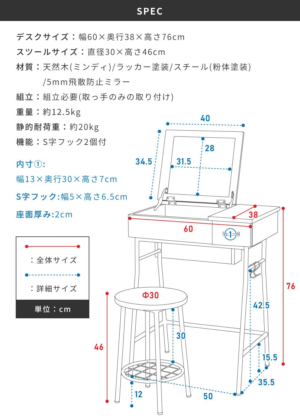 ドレッサーデスク おしゃれ アンティーク スツール セット コスメテーブル 化粧台 鏡台 ミラー コンパクト スリム 木製 スチール 引き出し レトロ ビンテージ