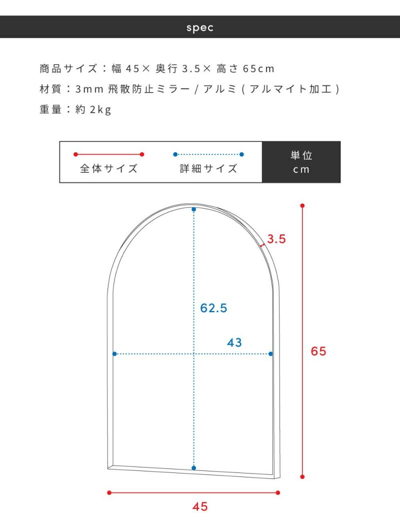 材質 3mm飛散防止ミラー/アルミ(アルマイト加工)