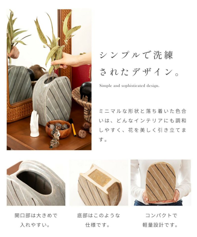 ミニマルな形状と落ち着いた色合いは、どんなインテリアにも調和しやすく、花を美しく引き立てます。