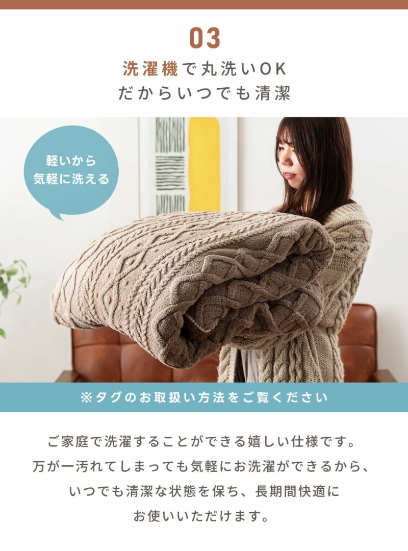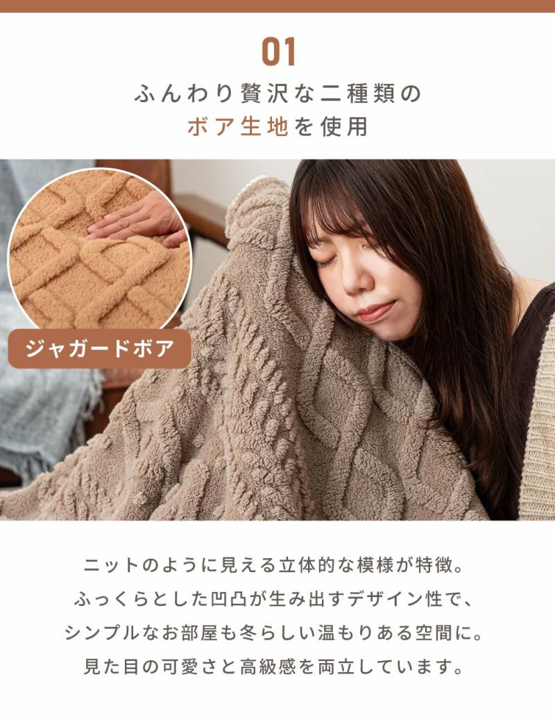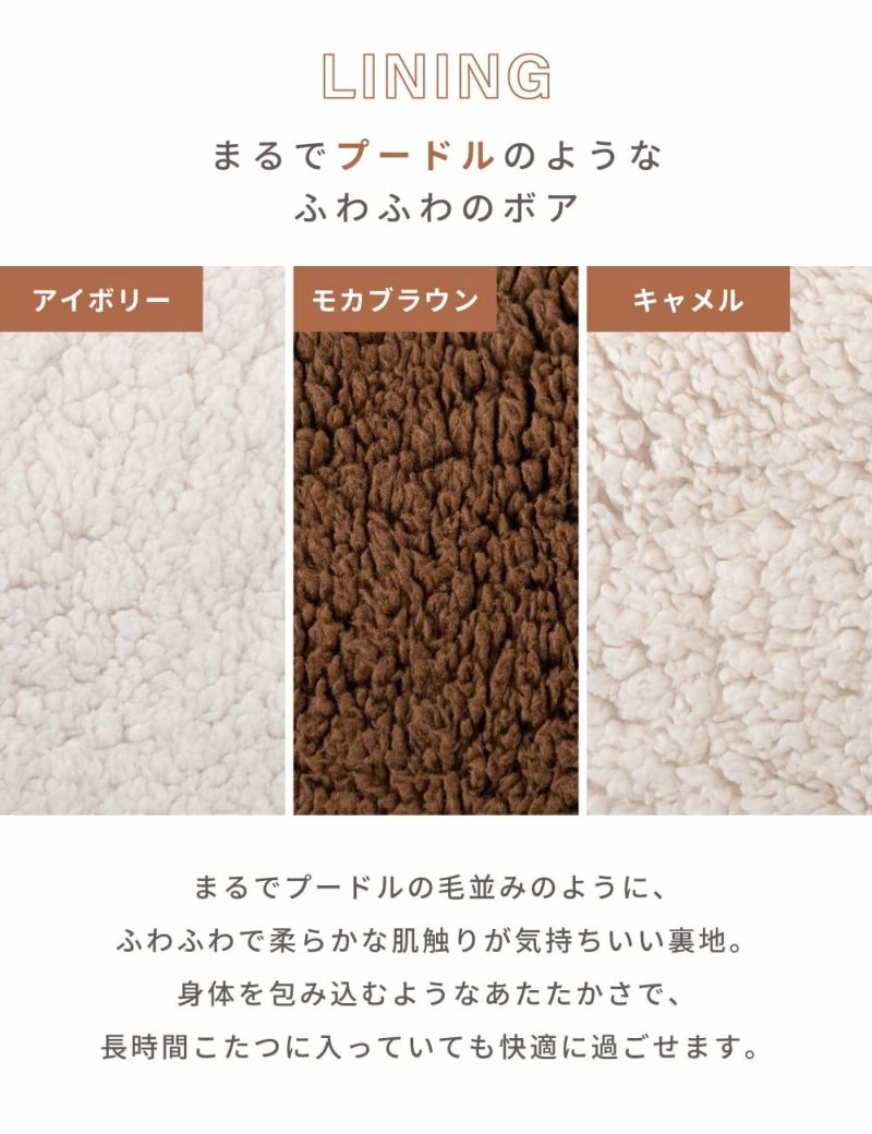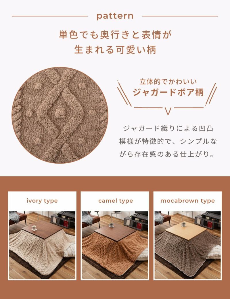 ふんわりとしたボア素材に、ジャガード織りならではの凹凸のあるデザインを施すことで、柔らかな触り心地と高級感のある見た目を兼ね備えています。肌寒い季節に温もりを与えてくれるこたつ布団です。
