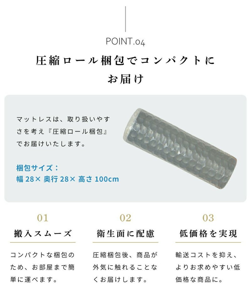 負荷のかかりやすい腰回りなどの沈み込みを防ぎ、安定感のある程よい硬さの寝心地となります。
