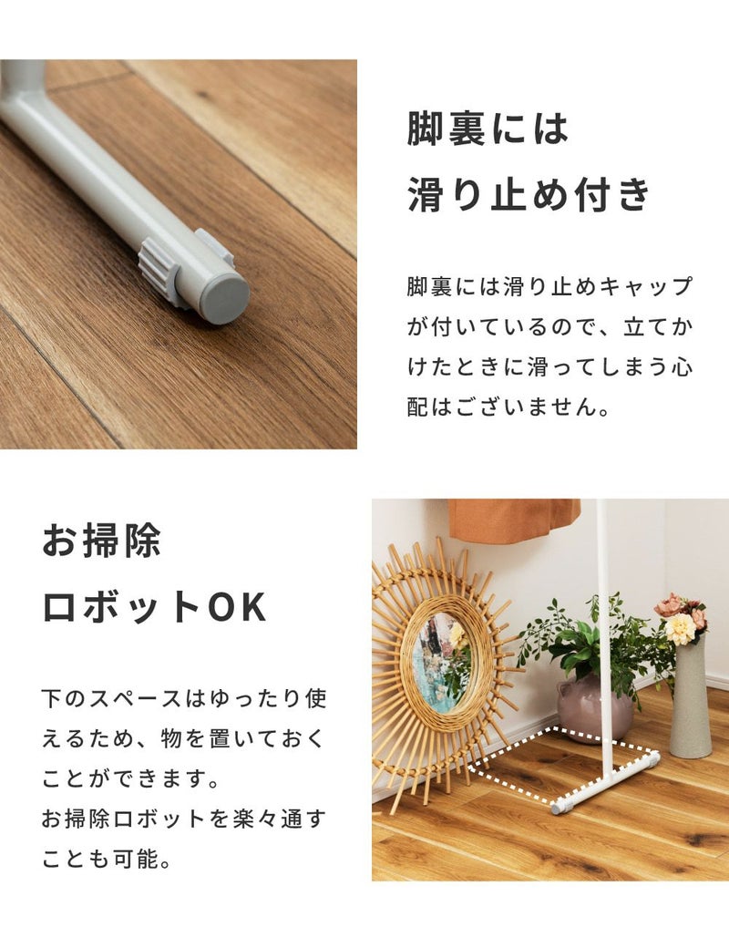 支柱一本で支えるハンガーバーは、前から見ても支柱で掛けた洋服がほぼ隠れずキレイに見えるシンプルデザイン。