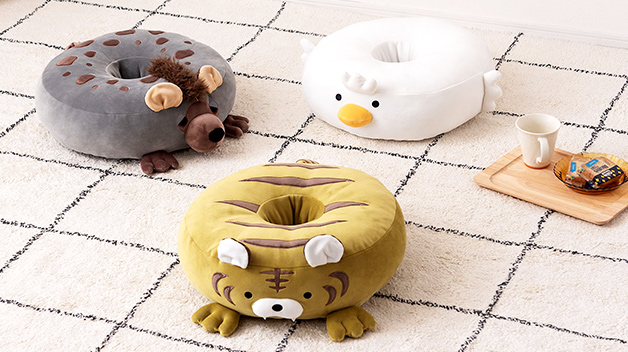 むちゅっと触感とぷっくりボディがきもちよくて幸せ気分...座っているときの負担を軽くしてくれるドーナツクッションです。 それぞれのアニマルのなまえと性格をご紹介ます。