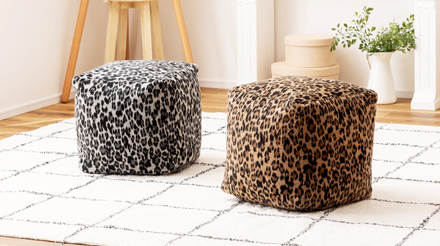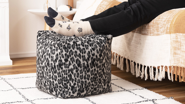 ヒョウ柄が個性的かつ大人かわいいキューブクッション。極小マイクロビーズがぎっしり詰まっていてへたりにくいのがポイントです。